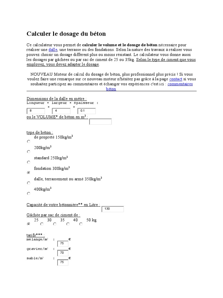 Calculer le dosage pour mon béton leroy merlin. La formule pour calculer le volume de béton dont vous avez besoin est. Par contre le calcul est différent selon la forme de l ouvrage. Un calcul supplémentaire est nécessaire pour définir le bon dosage de béton dans vos travaux.