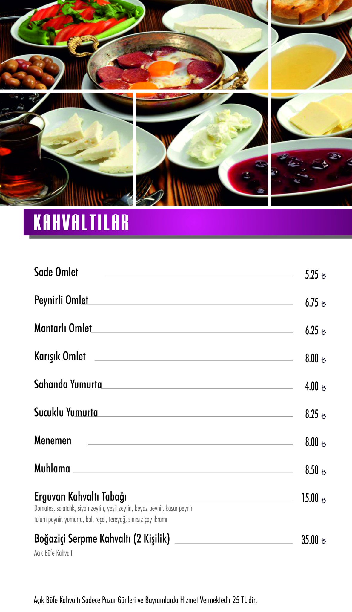 Erguvan restaurant aynı zaman da tüm gıdalarının helal olduğunu belirtmiş. Durum böyleyken kahvaltıda sınır tanımayan tüm türleri içine alan açık büfe kahvaltıya bir selam çakalım şehrin en iyi kahvaltı büfelerini teker teker anlatalım istedik. Açık büfe kahvaltısı zengin değil. Hafta sonu açık büfe kahvaltı oluyormuş.