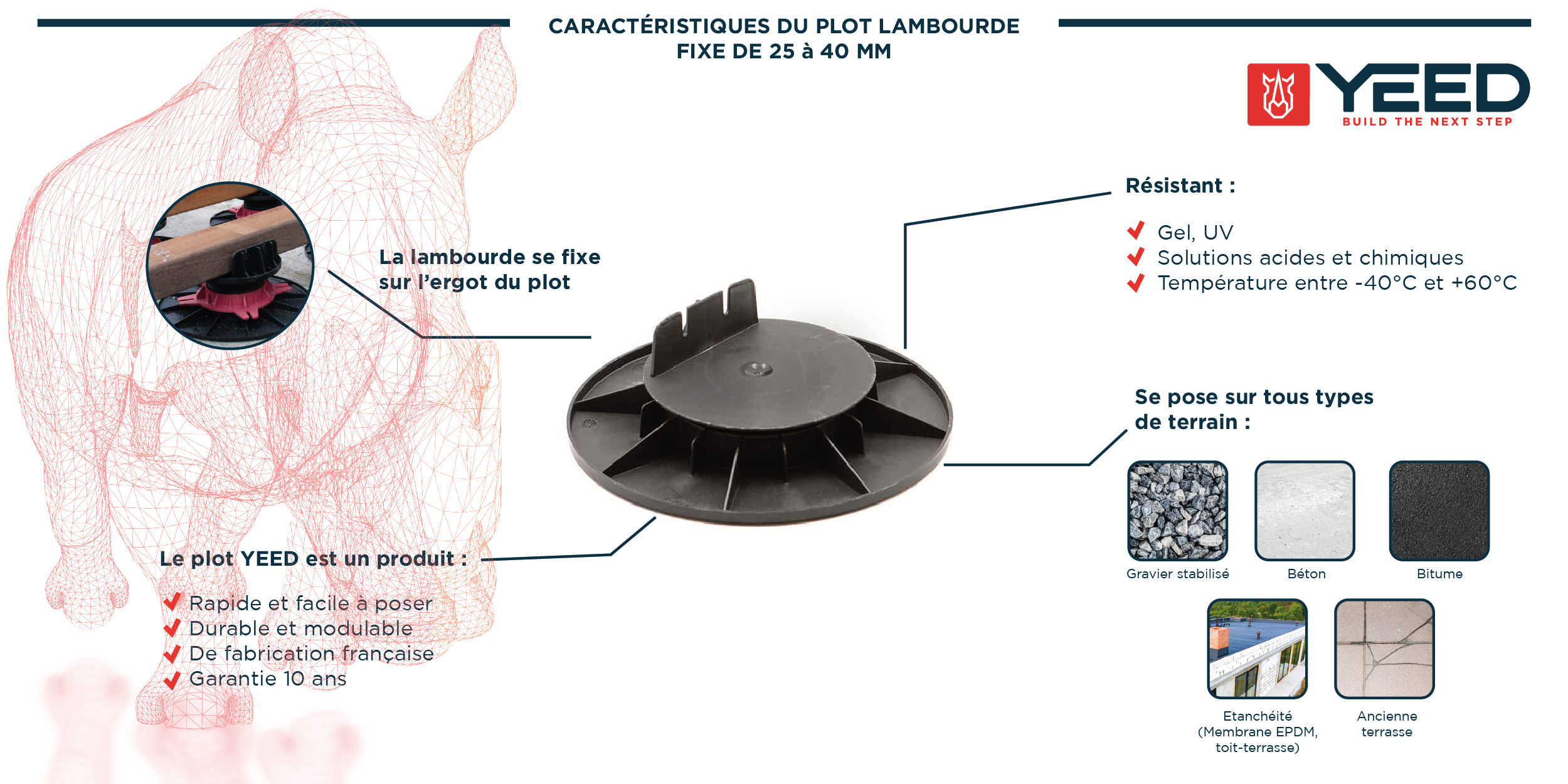 Embase de 200 mm de diamètre pour une parfaite stabilité. Supporte jusqu à 1 tonne de charge résistant aux uv au gel aux températures de 30 à 60. Les ergots sont les petites languettes présentes sur le plot qui vous permettent de. Vérifiez la planéité de la structure à l aide d un niveau à bulle.