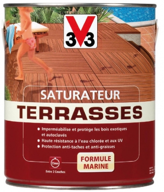 Saturateur v33 terrasse. Le saturateur haute protection v33 protège durablement des uv des taches et des graisses. Laissez sécher 24 heures. Le saturateur tenue extrême v33 est particulièrement recommandé pour une protection durable et efficace des planchers et caillebotis en teck bois exotique ou pin soumis aux agressions extérieures humidité uv eau chlorée. Travaillez par petites surfaces de 2m à la fois.