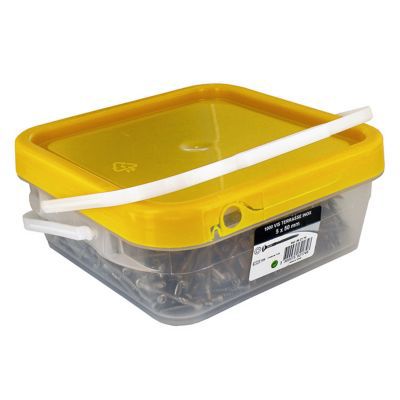 Seau vis inox terrasse. Seau de 400 vis terrasse inox a2 tête réduite crantée tx25 d. Grand choix parmi 59 vis spécial terrasse. Livraison rapide partout en france. 5 x 50 mm embout offert 9391564000 fixtout pas cher.