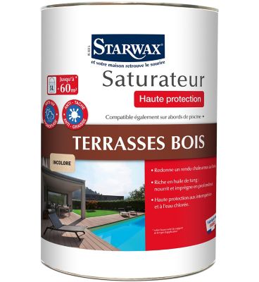 Ajouter au panier. Saturateur haute protection pour bois exotiques ou autoclavés neufs ou anciens riche en huile. Saturateur haute protection pour bois exotiques ou autoclavés neufs ou anciens. Saturateur terrasse en bois incolore haute protection 5 l 20 starwax 25 49 90 soit 8 32 l.