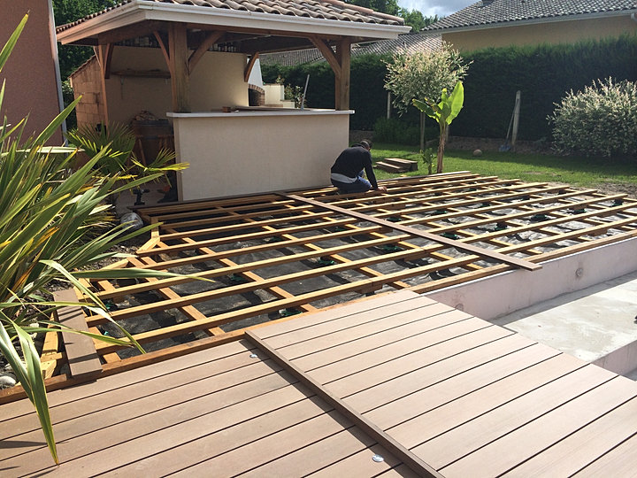 Terrasse en sapin bois exotique ou terrasse composite sur des ossatures en bois exotique pour garantir les produits 25 ans terrasse bois sur bordeaux et gironde construction abris bois constructeur de terrasse bois 33. Livraison sur toute la france.