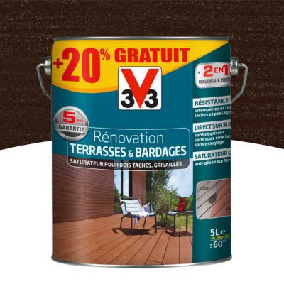 V33 saturateur terrasse. Le saturateur tenue extrême v33 est particulièrement recommandé pour une protection durable et efficace des planchers et caillebotis en teck bois exotique ou pin soumis aux agressions extérieures humidité uv eau chlorée. Travaillez par petites surfaces de 2m à la fois. La sélection produits leroy merlin de ce lundi au meilleur prix. Appliquez le saturateur rénovation terrasses v33 en couches croisées et régulières en évitant les surépaisseurs.